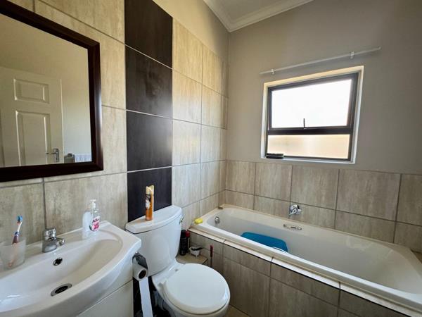 The home boasts two comfortable bedrooms, each fitted with built-in cupboards to provide ample storage. The tiled floors throughout the bedrooms offer a clean, contemporary finish that is both durable and easy to maintain. The main bedroom includes an ensuite bathroom, adding a touch of luxury and privacy, while the second bathroom serves as a convenient shared space.