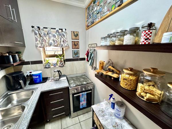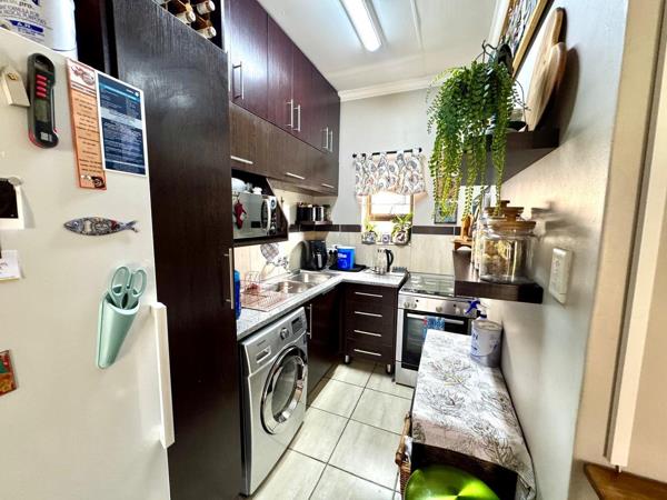 The unit includes two well-sized bedrooms, both equipped with built-in cupboards for optimal storage. The main bedroom features an en-suite bathroom, while a second bathroom serves the rest of the home. A gas geyser provides hot water throughout the unit, ensuring energy efficiency and uninterrupted comfort.