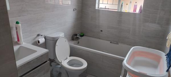 The home comprises three comfortable bedrooms, offering ample space for rest. The two bathrooms include one ensuite, providing privacy and convenience. The main bathroom features light-colored tiled walls, a bathtub, toilet, and a vanity, with a window allowing for natural ventilation. This pet-friendly property combines practical features with a secure environment, making it a compelling choice for your next home.
