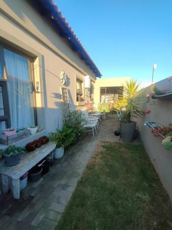 Outside, a private paved patio area provides an ideal space for outdoor seating and entertaining, complemented by various potted plants and a small lawn strip. This property also features a double garage and an additional parking space, ensuring ample secure parking for residents and guests on its 162 sqm erf.