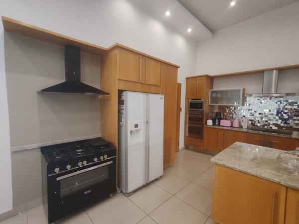 The modern, open-plan kitchen is a culinary masterpiece, featuring granite countertops, a centre island, and high-end finishes. It includes two extractor fans, a gas hob and oven, an additional electric stove, an eye-level oven, and a scullery with a dishwasher connection. The breakfast nook and pantry complete this space, blending practicality with contemporary appeal.