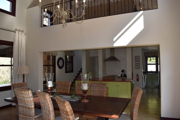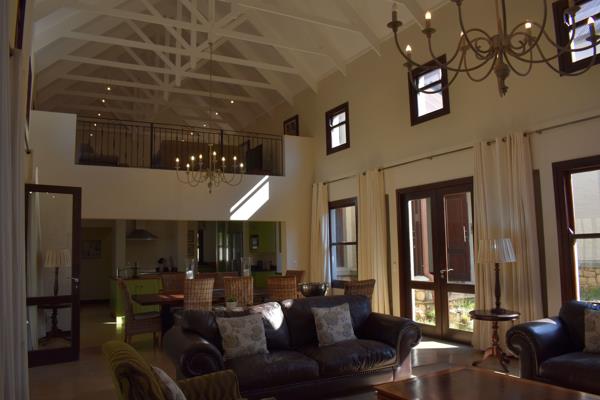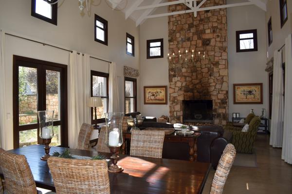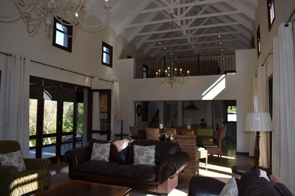 It has four bedrooms, all en suite, a spacious open plan lounge, dining and kitchen area with high ceilings, exposed beams and a large feature fireplace. There is an additional mezzanine TV lounge. 2.8m high sliding, folding doors opens on a large, covered veranda with built-in braai on the one side and a fireplace with seating area on the other. The views are through the mature oak trees across to the river and over one of the many dams on the Estate.