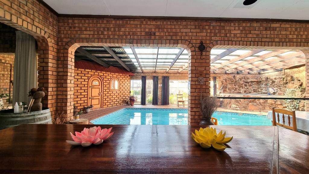 The main house includes a spacious kitchen with a scullery, two formal lounges, a dining area, and an indoor braai area. A serving counter/bar leads to a delightful indoor swimming pool, jacuzzi, and sauna.