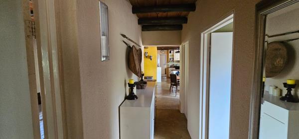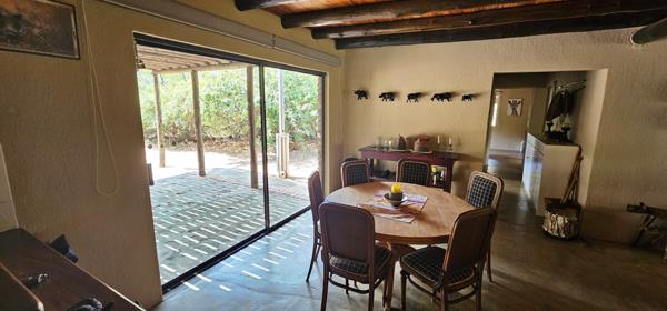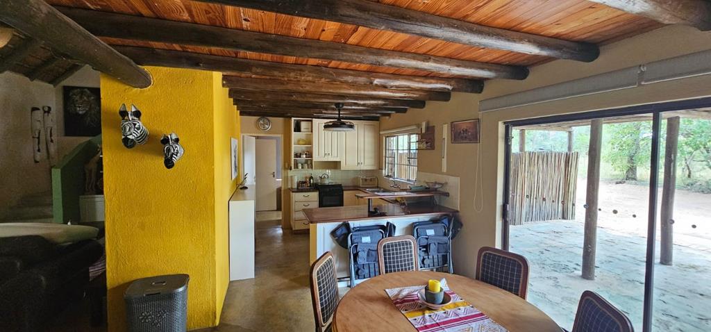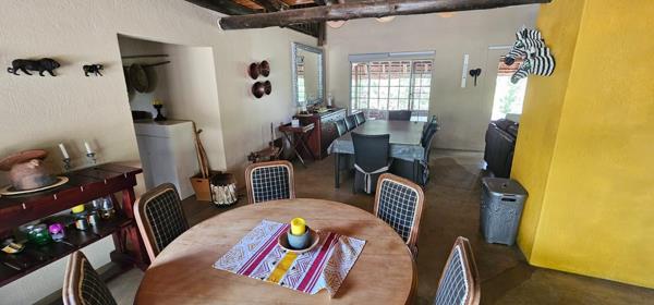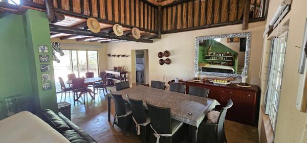 Step inside to discover an expansive open-plan living and dining area, characterized by high ceilings and exposed wooden beams that evoke a safari-lodge aesthetic. Large sliding glass doors flood the space with natural light and seamlessly connect to the outdoors. The functional kitchen, complete with a scullery and ample storage, caters to all culinary needs, while the unique African-inspired decor adds a vibrant, authentic touch throughout.