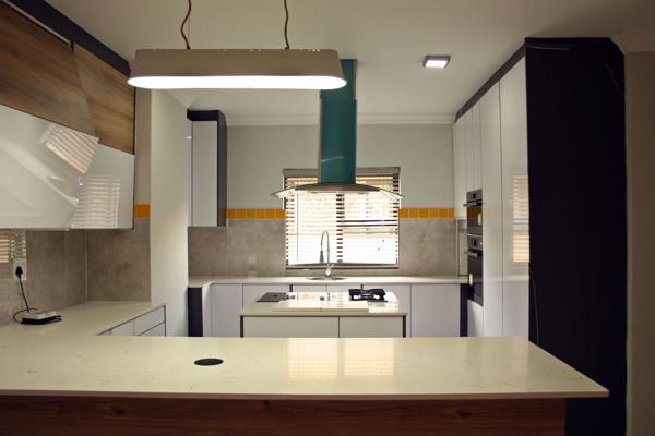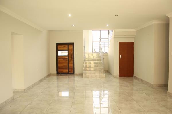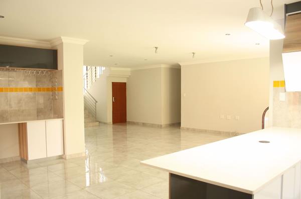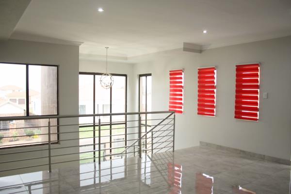 Luxury and Security. A double storey property, with endless, open plan spaces. Ultra modern kitchen with a separate scullery and walk in pantry. Two bedrooms and a study is located on the ground floor (Ideal for teenagers or granny). The stainless steel hand rail guards the staircase, and introduce you to the upstairs lounge. The three bedrooms upstairs, all have their own balconies, and ample storage. This large corner stand property is fenced with clear-view fencing, adding to the luxury.