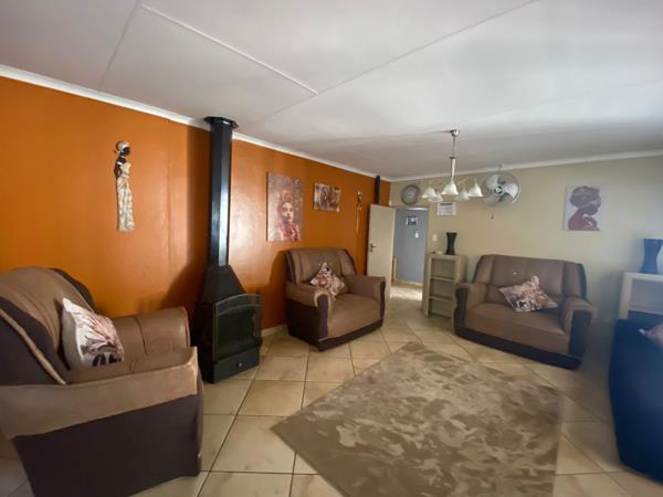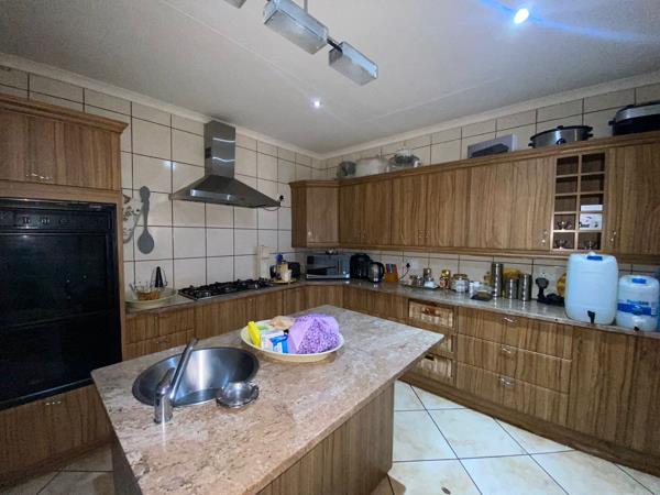 The kitchen is well-equipped with a gas stove that is ideal for cooking during loadshedding, offers ample cupboard space and a central island that provides a convenient workspace for preparing food. The separate scullery provides a dedicated space for washing dishes, which helps keep the kitchen clean and organized.