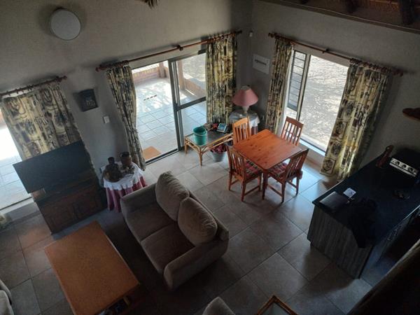 Upstairs, a versatile loft space awaits, complete with two single beds and built-in storage, ideal for use as a home office, guest room, or extra sleeping area. Aluminum mesh security doors and window screens allow you to enjoy fresh air and bushveld views.