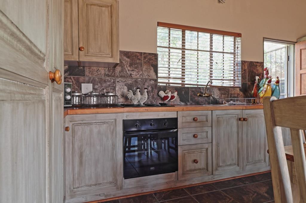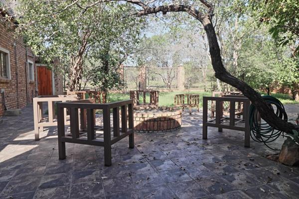 In the scenic Marloth Park Holiday Town, this exquisite property boasts a breathtaking entertainment area and enjoys a tranquil setting amidst verdant greenery. The highlight of the premises is an enclosed space featuring a charming Lapa, adorned with a traditional thatched roof. The Lapa is complemented by stacking doors, which seamlessly connect to an open-plan kitchenette and a cozy lounge area complete with a breakfast nook. This vantage point provides delightful vistas of the boma braai area, an idyllic spot dedicated to outdoor barbecues.
