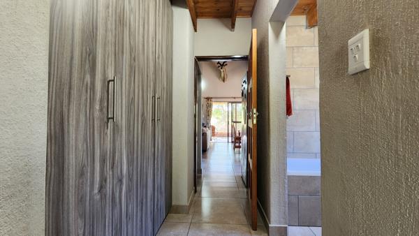 On the outside is a lovely braai Boma, a single garage and a spacious laundry room with build in cupboards and a double shade port.