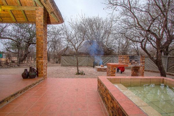 Rare find not to be missed. Suited for a big family or over seas investors. You will be delighted in the animal night sounds. Prime location near the river and wild life. House and a separate cottage, both thatch roofed. In the majestic double story main house you will find 4 bedrooms and 3 bathrooms. The main bedroom (on suite) has doors leading outside onto the veranda. Open plan double volume living areas. Spacious kitchen. Up stairs you will find another living area. Two of the four bedrooms are upstairs. the house is fitted with aircons.