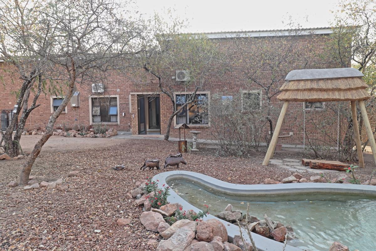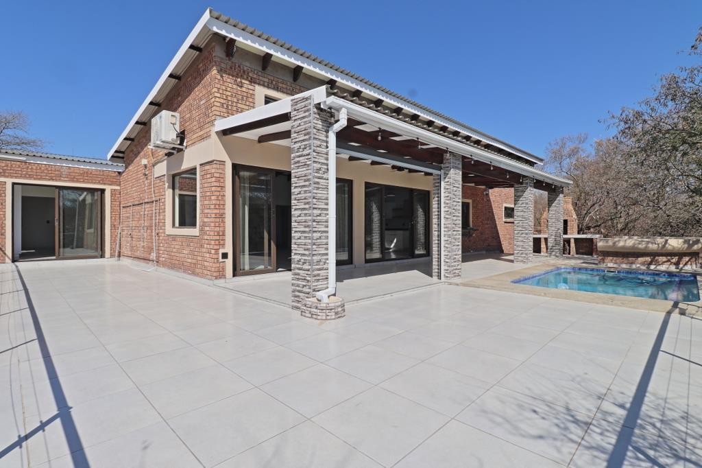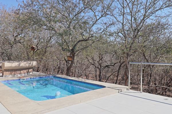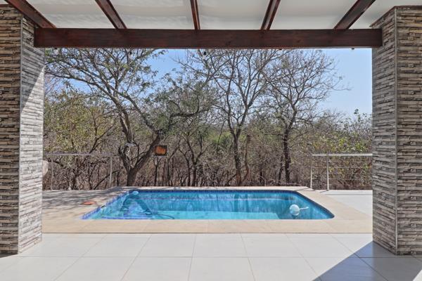 Ultra-modern layout with separate scullery, laundry, and walk-in pantry with service hatch. Outside flows from covered patio to pristine pool to braai boma with built-in seating all oriented toward the watering hole where Marloth Park actually happens.