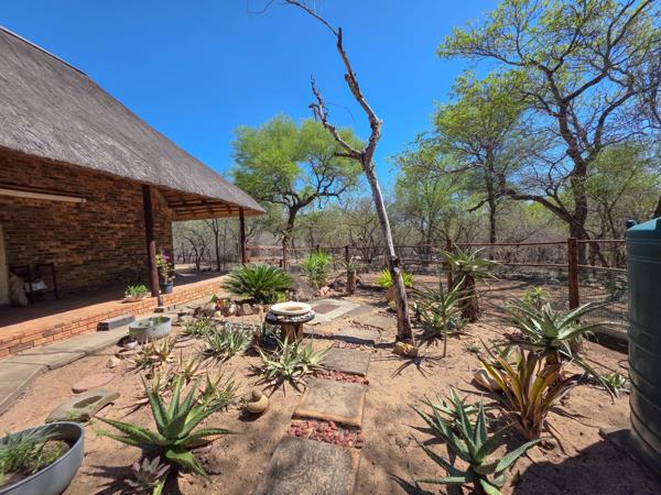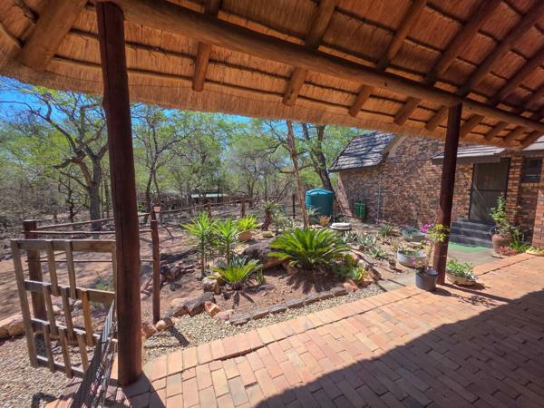 Charming Bush Escape 3-Bedroom Home with Modern Comforts. This inviting 3-bedroom, 3-bathroom residence perfectly blends bushveld charm with modern convenience. The home features double-volume ceilings with exposed beams, creating a light, spacious, and airy atmosphere that enhances the open-plan layout.