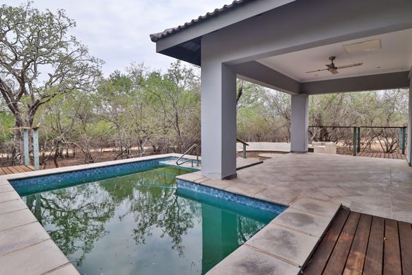 The interior showing high ceiling rafters enhancing the spaciousness. Outside a boma area with the pool offers hours of relaxation.