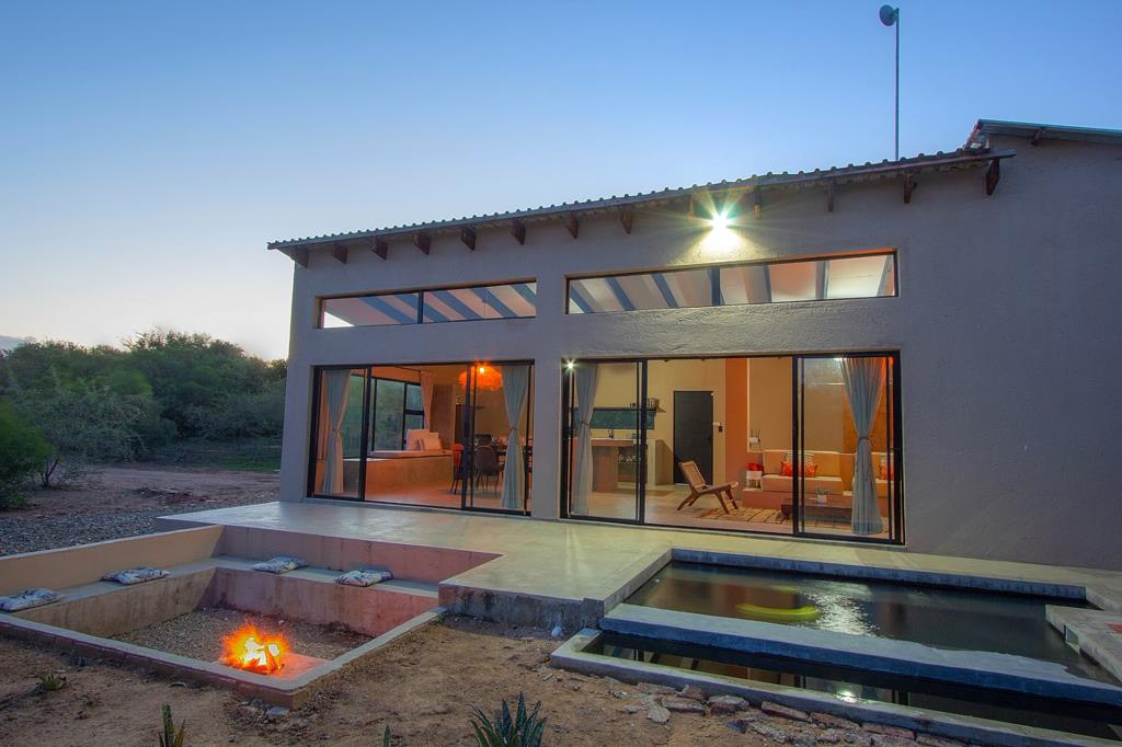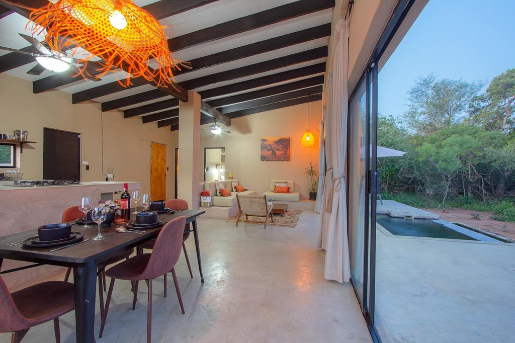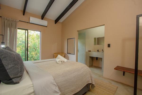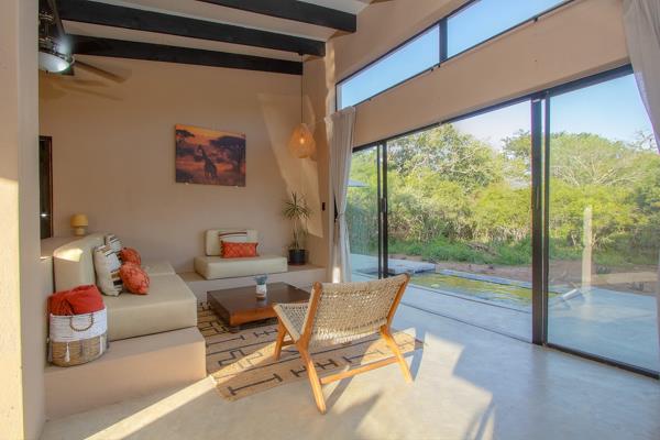 This home offers an open plan kitchen and living area. The lounge opens onto an expansive veranda, accommodating a plunge pool and firepit. The two bedrooms have en-suites with one bathroom having a shower and the other a bath.