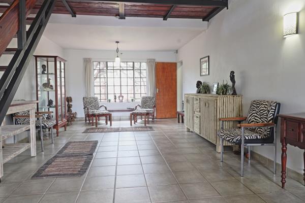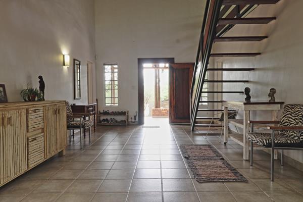 An elegant dark wood staircase ascends to a refined landing, opening onto a commodious dining area and an oversized kitchen complete with walk-in pantryideal for the discerning host. A guest powder room serves this level with discretion. The expansive living deck spans the entire width of the residence, offering captivating views directly into the Kruger National Park, creating an unparalleled entertainment and relaxation space.