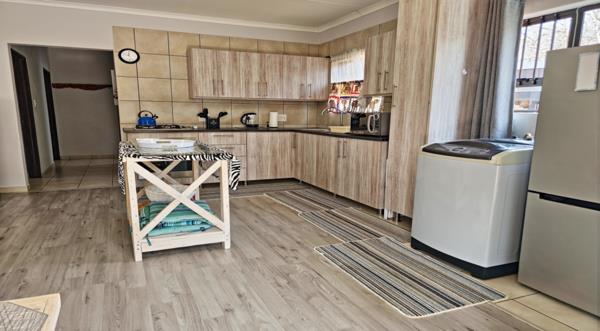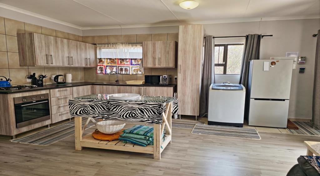 The home features two spacious bedrooms, each with its own en-suite bathroom, ensuring privacy and convenience for both residents and guests. The open-plan kitchen and family room create a welcoming space for entertaining, relaxing, or simply enjoying the peaceful ambiance of the bushveld.