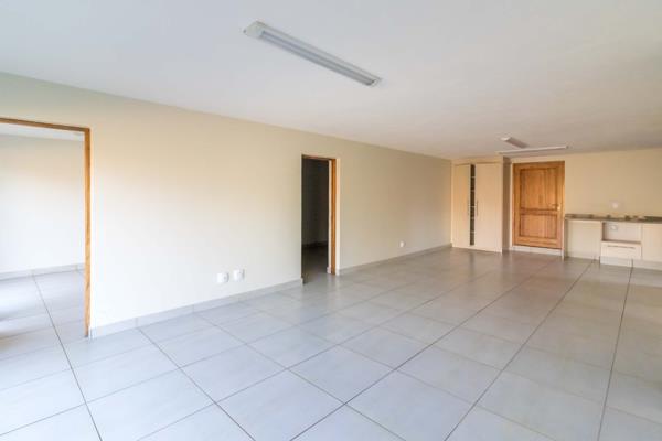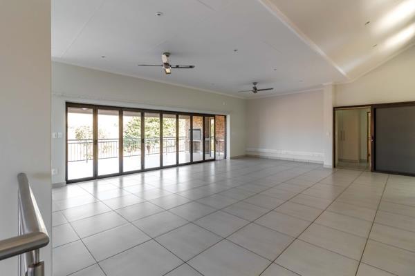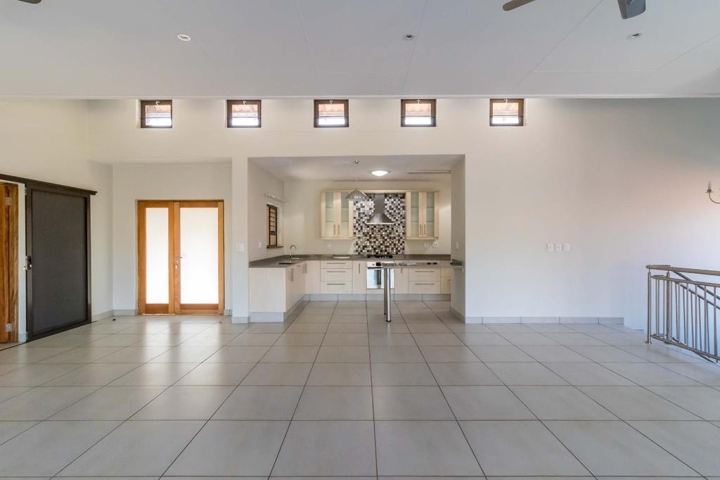 Open plan living area with enough space for a lounge and dining area free flowing onto a patio area with a built in-braai and overlooking the green belt