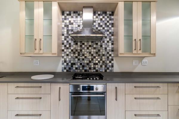 A modern kitchen with gas stove, breakfast nook and separate scullery and laundry area