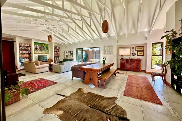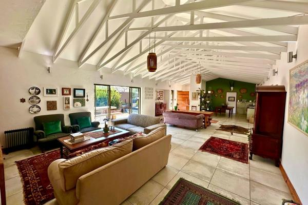 The expansive open-plan living area includes a lounge, dining room, and a chef-style kitchen with soaring high ceilings, exposed wooden beams, and modern finishes. The kitchen also boasts a walk-in scullery and a separate laundry room, making entertaining and everyday living effortless.