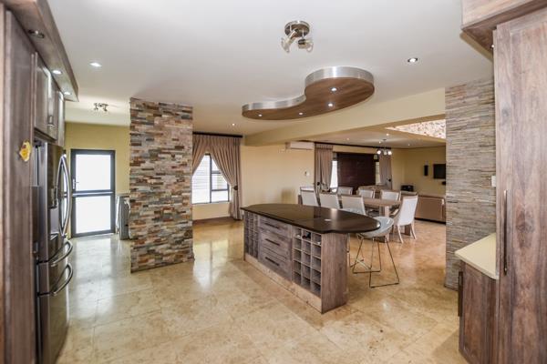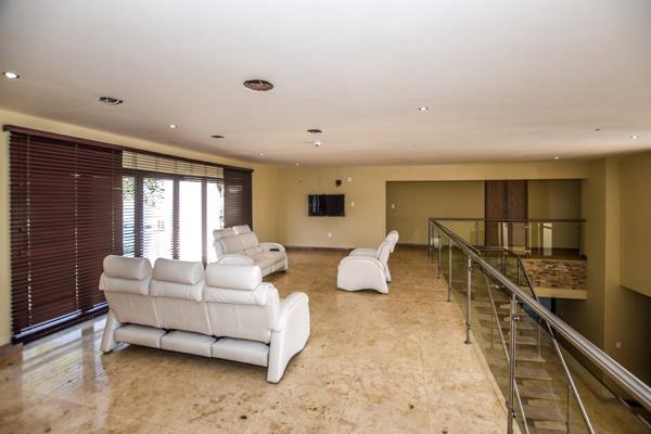 All the bedrooms (4) are en-suite, air-conditioned and very spacious The ultra modern kitchen offers a gas stove with built in eye level oven and microwave. There is a separate scullery. You have two lounges plus an additional playroom and a study which is ideal for working from home. The living area opens up to an undercover entertainment area with a built in braai. The four automated garages offer ample parking for all your toys. This is truly an entertainer''s dream.