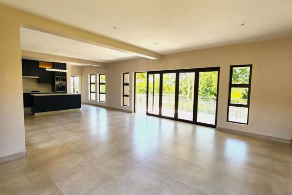 The open-plan living area seamlessly connects the living room, dining room, and kitchen, creating a bright and airy space perfect for entertaining. Stacking doors lead to a covered patio with a built-in braai and ample counter space, overlooking a beautiful yard with a sparkling blue pool ideal for relaxation and gatherings.