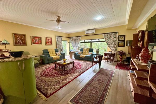 The heart of the home is a grand open-plan living and dining area with soaring high ceilings, designed to create an airy, light-filled atmosphere. Large sliding doors lead to a covered patio that overlooks the river, complete with a built-in gas braai, air vent, and a convenient outdoor kitchenetteideal for entertaining in any season.