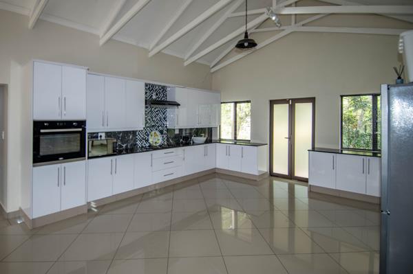The heart of the home features a sleek, open-plan kitchen fitted with a electric stove, electric oven, high-end finishes, and ample cabinetry. A separate scullery keeps the main area clutter-free and adds to the homes practical layout.