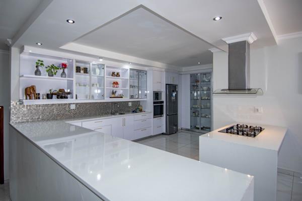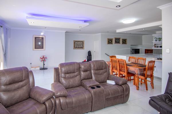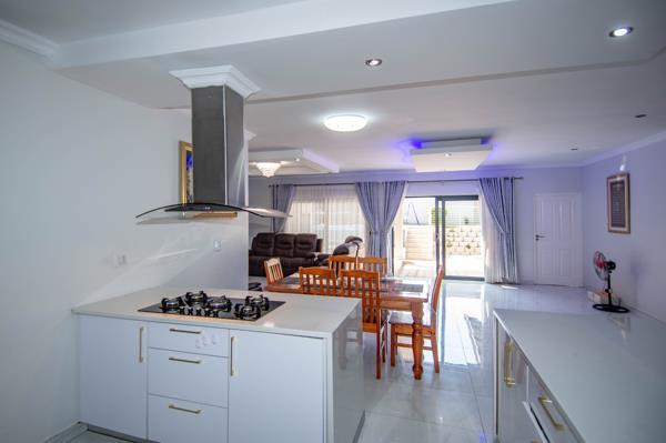 As you enter through the foyer, you are greeted by light-filled, open-plan living spaces that flow effortlessly from the sophisticated kitchen through to the spacious lounge and dining areas. Tiled throughout for easy maintenance and timeless style, this home is designed for easy indoor-outdoor living with stacking doors opening onto a covered patio featuring a built-in braai that is ideal for entertaining while overlooking the sparkling pool and garden.