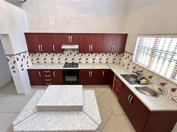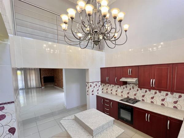 This beautifully designed home welcomes you with a large semiopen plan kitchen and dining area. The kitchen features an electric stove and oven with extractor fan, complemented by a spacious separate scullery and ample cupboard space. A stunning chandelier draws your eye from the heart of the kitchen and continues as a design highlight up the staircase.