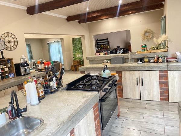 Open plan kitchen-, dining-, entertainment-, and living room areas.