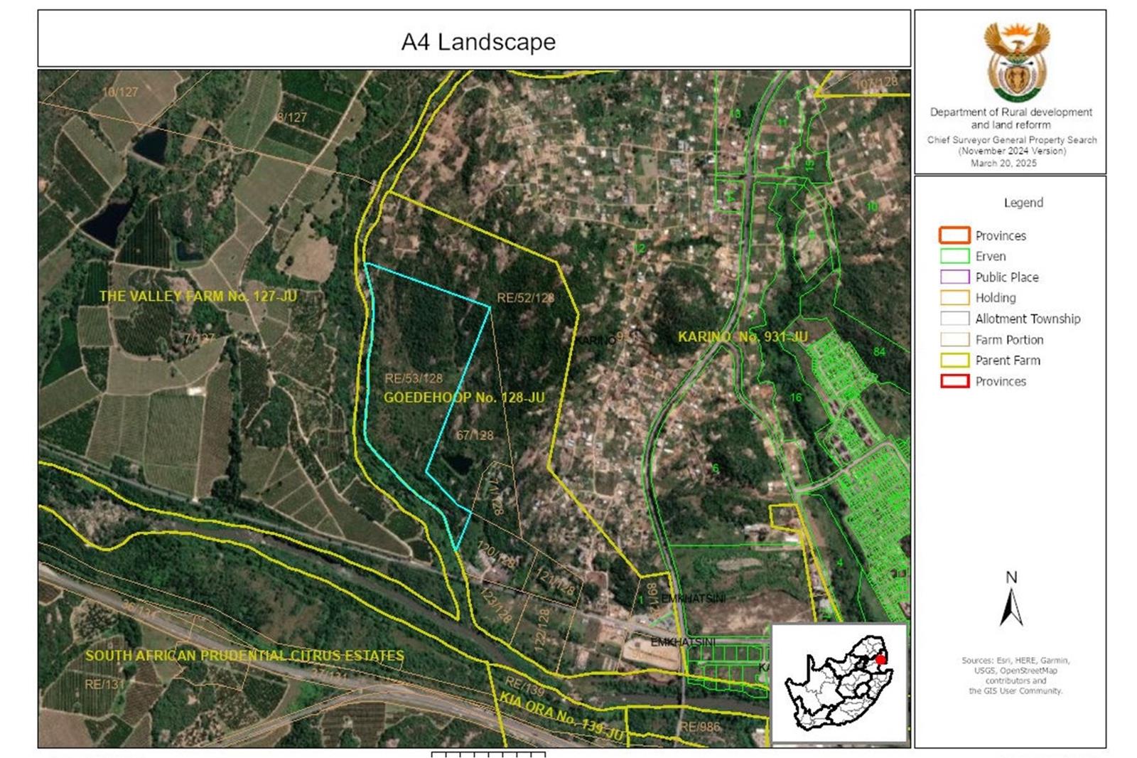 Tis valuable farm land is situated next the the White River (a subsidiary of the Crocodile River) The property was previously used as an Citrus orchard farm. Currently there i no farming actives on the land, although there is sufficient water rights available form the White River and Crocodile river Irrigation schemes. Most of the land is arable with rocky outcrops on the perimeters of the farm. The farm is zoned for Agricultural use, but can be rezoned for residential development as is is near the developing Karino suburbs. The land is suitable for large developments such as schools or other training facilities.