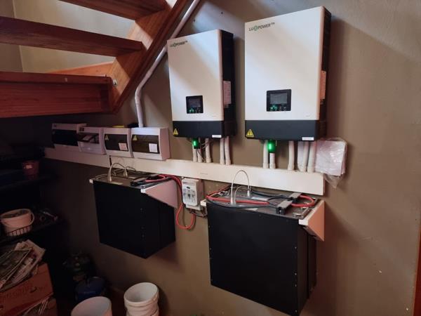 * Borehole producing 1,800 liter per hour, 5,000 and 10,000 liter water tanks, and a robust solar system with four Lithium batteries, 2 x 5Kva Inverters and 24 solar panels for off the grid living.