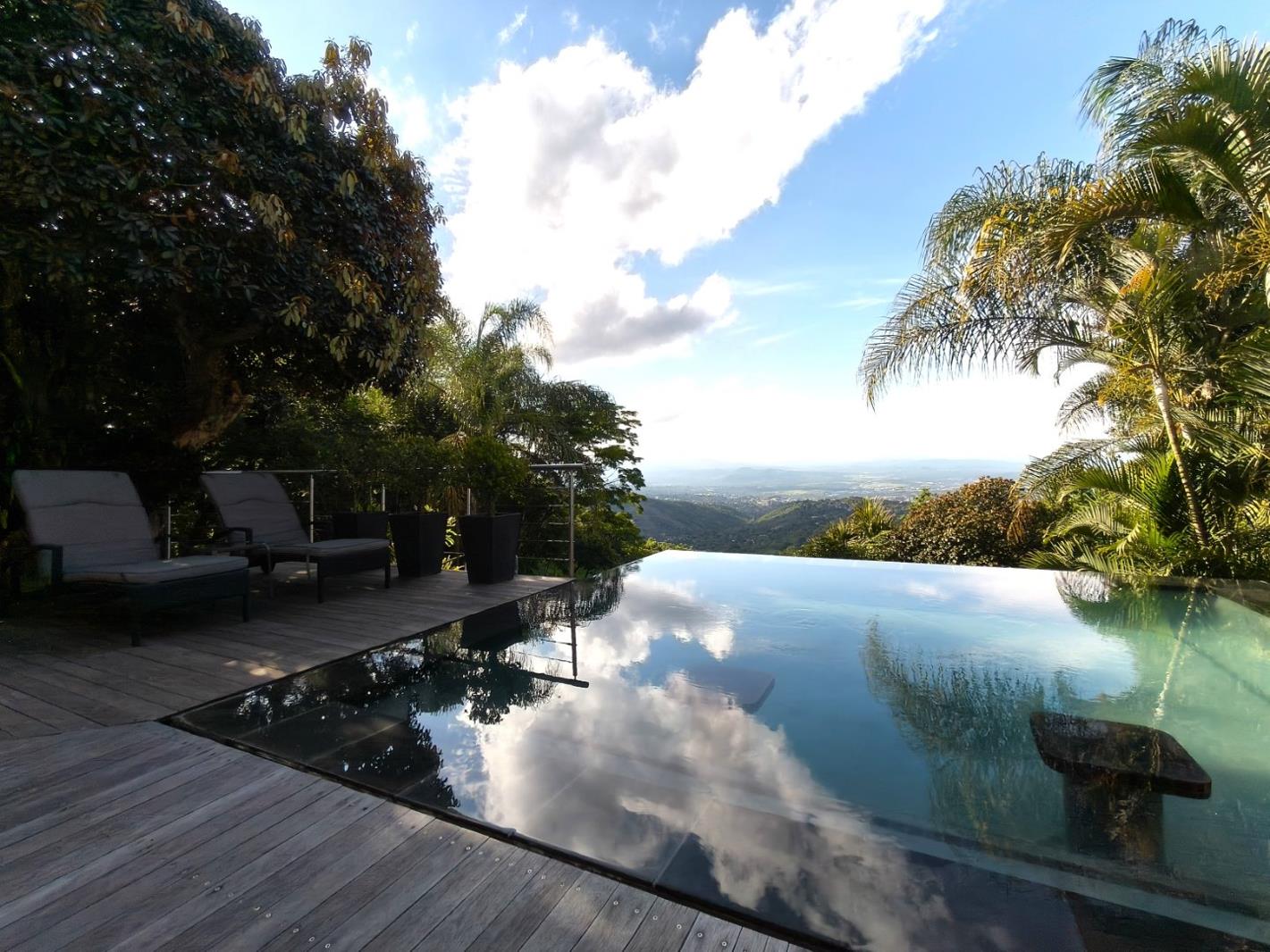 An upstairs leisure loungecinema room and balcony, offering elevated views across manicured gardens and the sparkling pool.