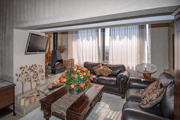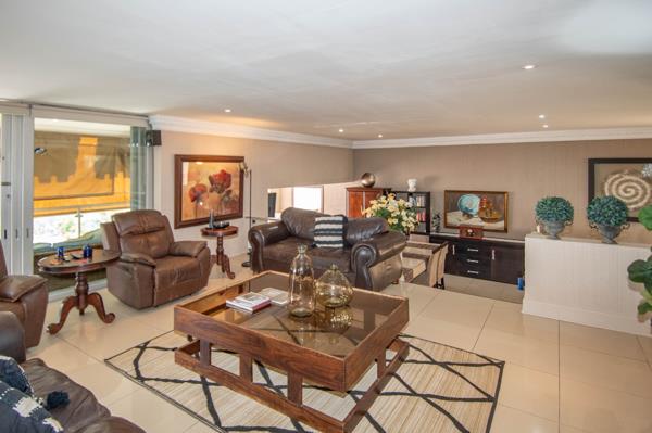 Flowing from the TV room is a covered patio with roll-down canvas blinds, perfect for enjoying relaxed mornings or sundowners. This extends to a vast outdoor entertainment area featuring a built-in braai and ample space for umbrellas and seating, all set against a stunning 180-degree panoramic backdrop.