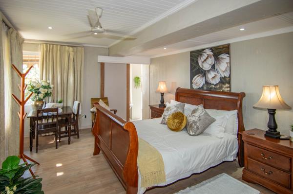 The home boasts five generous en-suite bedrooms, ideal for a growing family or hosting overnight guests in comfort. The master bedroom has a walk-through dressing room and private wooden deck. The modern kitchen is fitted with high-gloss cabinetry, granite countertops, a gas hob and a double eye-level oven. A built-in breakfast nook, walk-in pantry, scullery and laundry room ensure style meets practicality in every detail.