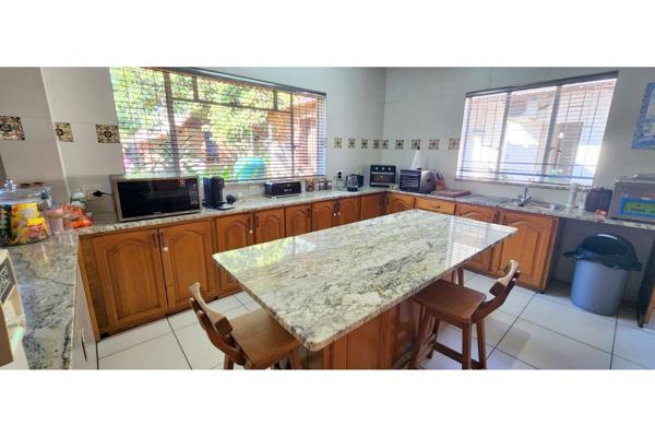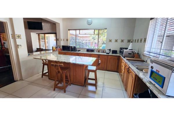 The open plan living area caters for the lounge, dining room and patio with sliding doors. Exit to the entertainment lapa and pool. There is a build-in bar. The pool makes an integrated part of the garden which has sufficient lawns for children to play. There is also a boma with a pizza oven. This property is well suited for the family who likes to entertain.