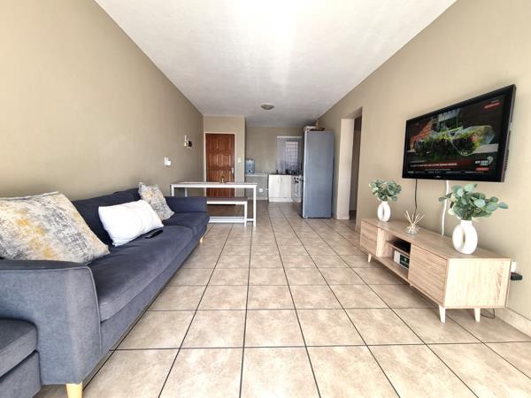This modern apartment features a sleek, open-plan kitchen that boasts stunning beige cabinetry and elegant black granite countertops. It includes an under-counter stove and offers ample space for a large refrigerator. A back kitchen door leads to the communal gardens and washing lines. The kitchen seamlessly flows into a dining area and a cozy lounge, complete with a TV connection and a refreshing breeze from the aluminum sliding door. Additionally, the apartment has its own private patio with a built-in braai.