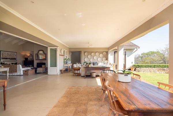 An inviting entrance hall beckons you into the heart of this home, which is the spacious living area that combines both style and functionality. This space has a lounge area with a fireplace that will be a divine end to a chilly winters day, as well as the dining area which is spacious and ideal for both hosting as well as relaxed meals with the family. Stack doors lead you straight onto the covered patio, which offers incredible views no matter the weather.