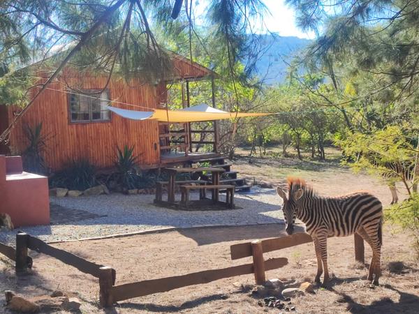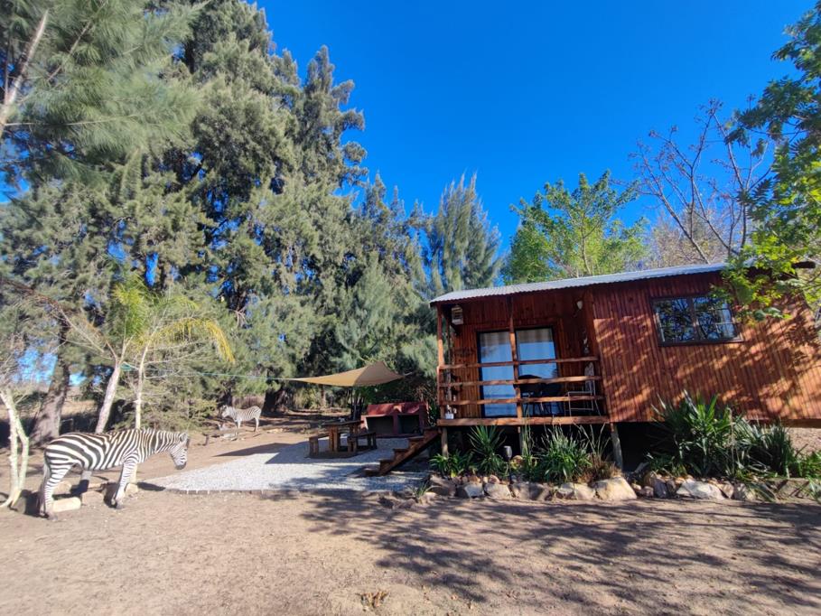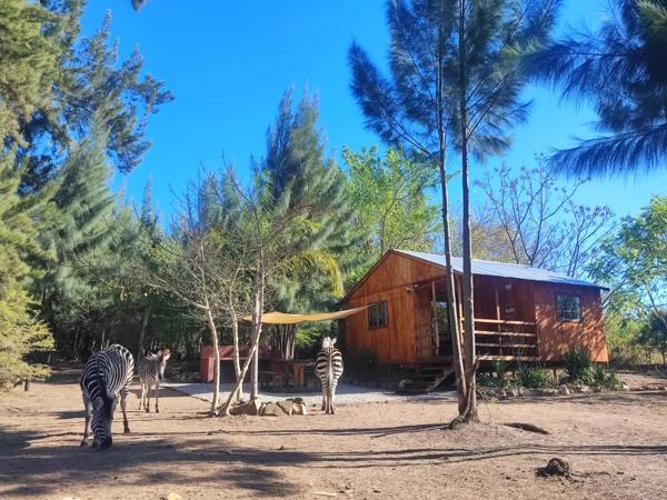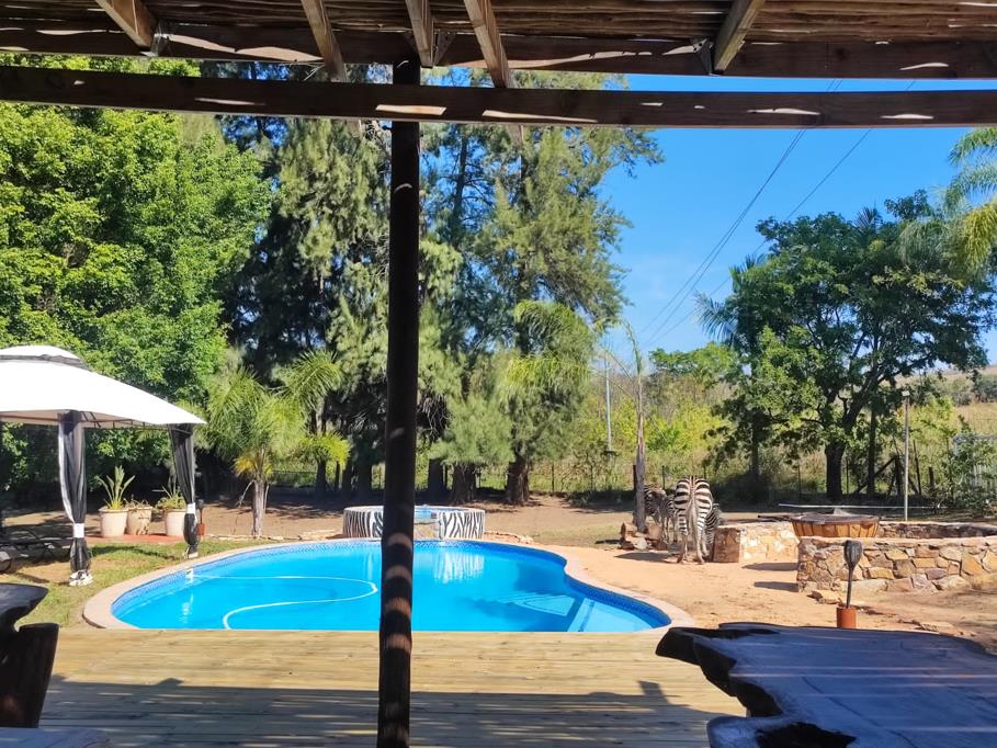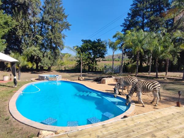 14 Bed International Lodge with 2 self-catering cozy cottages, 1 studio and 1 5pax Family room, Pool, Spa, Braai Boma, 100 sqm wooden deck overlooking the pool, the stream and dam, Cocktail Pub Corner, Reception, Shop.and Function venue. Includes all furniture, fittings and 2 Zebras
