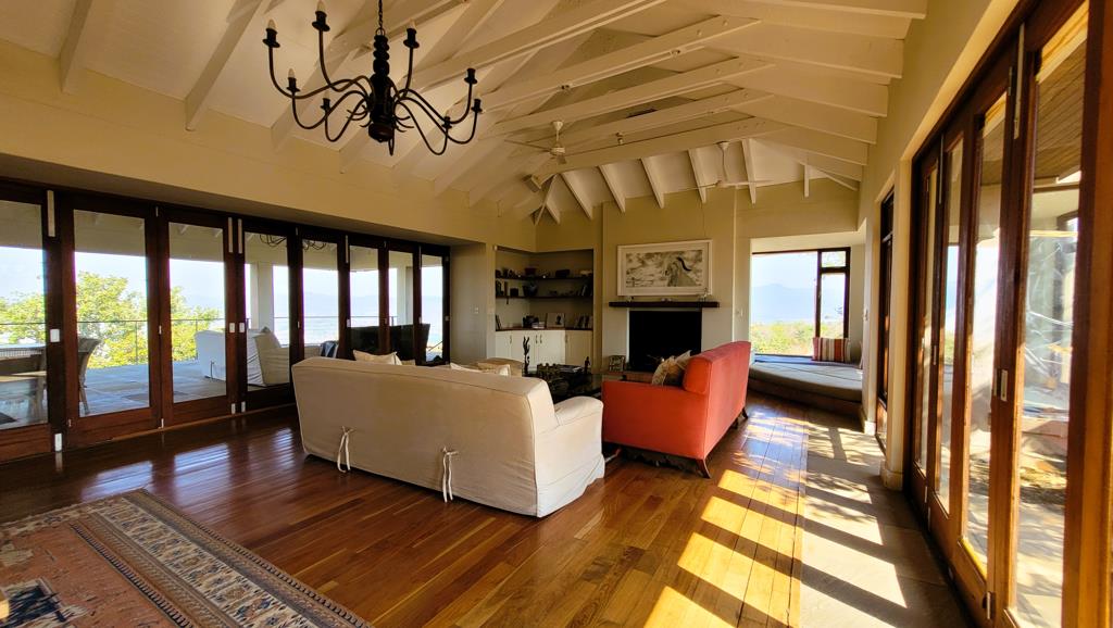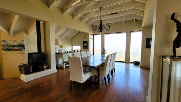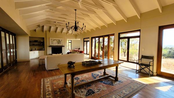 The main house includes three bedrooms and three bathrooms, with the main bedroom offering en-suite convenience. A separate guest toilet adds flexibility for entertaining. High-volume ceilings and open-plan living areas connect seamlessly to a large verandah that frames uninterrupted views over the Lowveld landscape. A wine cellar, linen room, and playroom round off the main residence, while the swimming pool offers a cooling retreat overlooking the reserve.