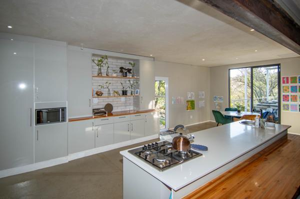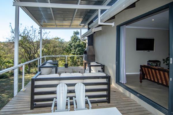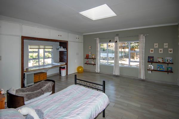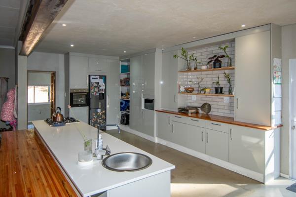 At the heart of the property is a stylishly renovated farmhouse offering generous space and comfort. The home features three spacious bedrooms and two full bathrooms. The kitchen is a standout with sleek high-gloss cupboard doors, durable EasyQuartz countertops, and a stunning solid saligna breakfast counter ideal for family meals. The open-plan living and dining area is fitted with a cosy fireplace and opens onto a large wooden deck with a built-in braai the perfect spot to relax and enjoy breathtaking views over the countryside.