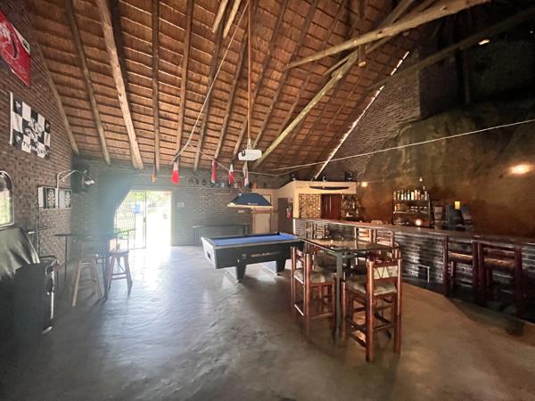 The plot contains a main house, several self-contained units, entertainment facilities and full camping infrastructure create a versatile environment suited for long-term accommodation or income generation. Two large swimming pools, a bar area for events, abundant outdoor space and well-established services such as Eskom power, borehole water pumps 1,800L/hour and ablution blocksprovide everything needed to operate comfortably and efficiently.
