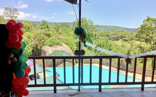 Unique large swimming pool, with a natural rock feature, is complemented by a kiddies pool.