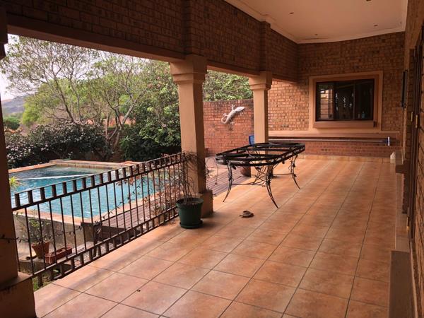 Living areas flow to a covered patio with built-in braai, overlooking a sparkling swimming pool