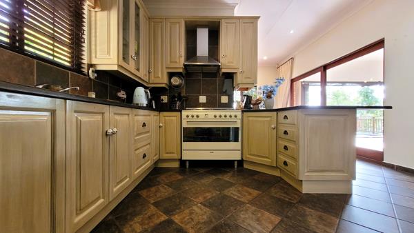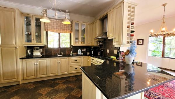 The modern kitchen is fitted with a Smeg gas stove and electric oven and a separate scullery. Every detail adds to the homes character, from the stunning chandeliers, ticky creeper covered walls to the iron decor features