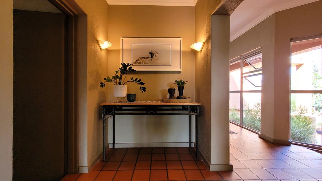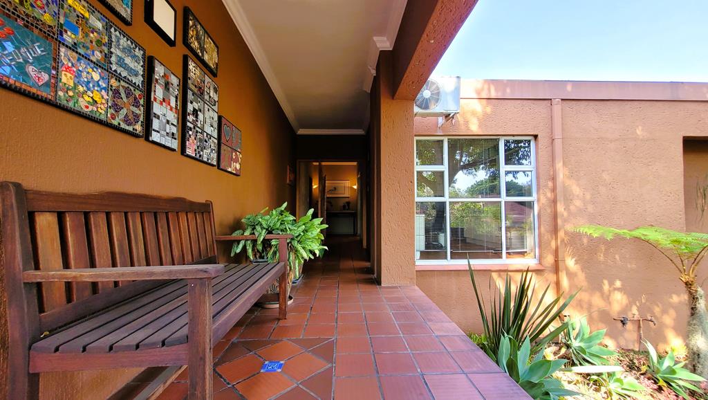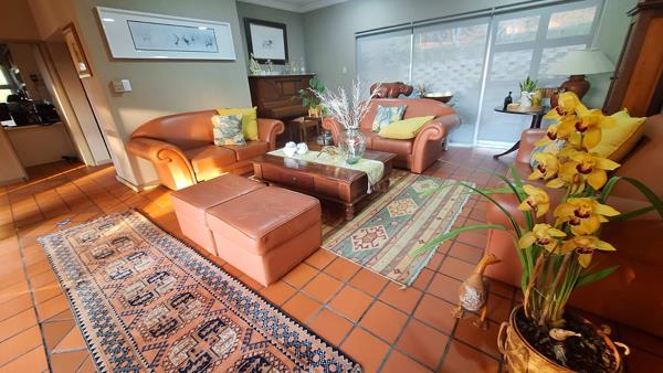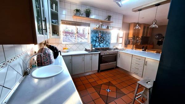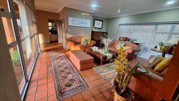 The home welcomes you with an impressive foyer, leading to spacious living areas that include two lounges and a dining room fitted with built-in oak cupboards. The neat kitchen is well-equipped with a gas stove, electric oven, pantry, and separate scullery.