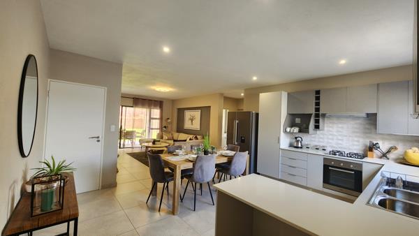 The modern kitchen is the heart of the home, featuring sleek finishes, a gas hob, and stylish Caesarstone countertopsperfect for preparing family meals and enjoying quality time. The large, welcoming living areas flow seamlessly to the outdoor patio, where the family can relax, entertain, or enjoy a casual braai together.