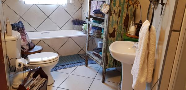 The home offers three well-sized bedrooms and two bathrooms, including a luxurious main en-suite with a shower, toilet, basin, and a walk-in cupboard. The two additional bedrooms share a modern full bathroom complete with a bath, shower, and toilet.