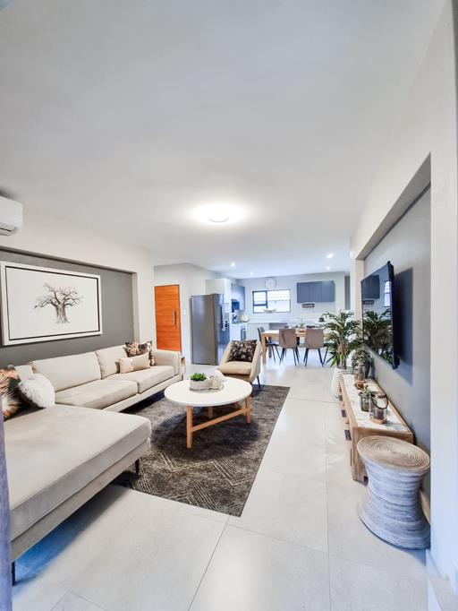 Discover the perfect blend of security, style, and convenience with this beautiful three-bedroom townhouse located in the sought-after West Rock Villas, Stonehenge Ext 14. This modern home is designed for comfortable living, offering a spacious lounge and dining room, a well-equipped kitchen, and two bathrooms, including an en-suite in the main bedroom. The bedrooms are well-sized, with built-in cupboards, providing ample storage space.