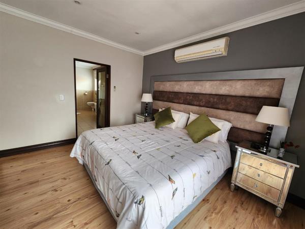 When you arrive at the impressive Front Door with large Stone cladded Pillars, you enter into a double volume Reception area. From the reception area you will find a lovely Lounge and Open Plan Kitchen and Dining room with access to a spacious patio. The Patio with a built-in braai is overlooking the beautiful private backyard with garden and swimming pool. The view extends over a well known wildlife estate giving a sneak peak at some game animals. There is also a spacious office with access to the patio.
